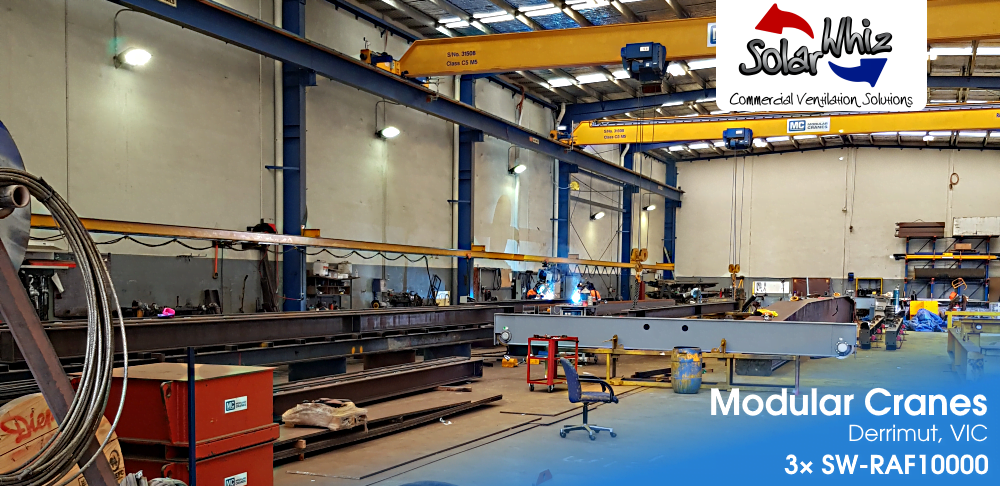 We proposed installing 3× SW-AU-C-155 industrial roof exhaust fans. Modular Cranes had around 11 existing industrial whirlybirds already installed, which would reduce the effectiveness of our extraction fans. This is because the Solar Whiz roof exhaust fans draw replacement air from the closest available source, which in this case, would be the openings from the closest whirlybirds.