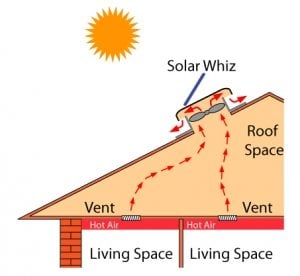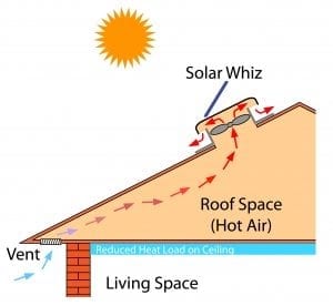 Solar fans like Solar Whiz work by extracting hot and/or contaminated air and replacing it with cooler, ambient air.